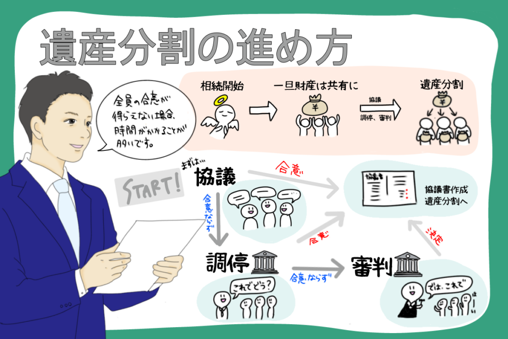 遺産分割はまず相続人全員の話し合い(協議)から始まり、それが調わない場合には家庭裁判所での調停や審判へと移行します。